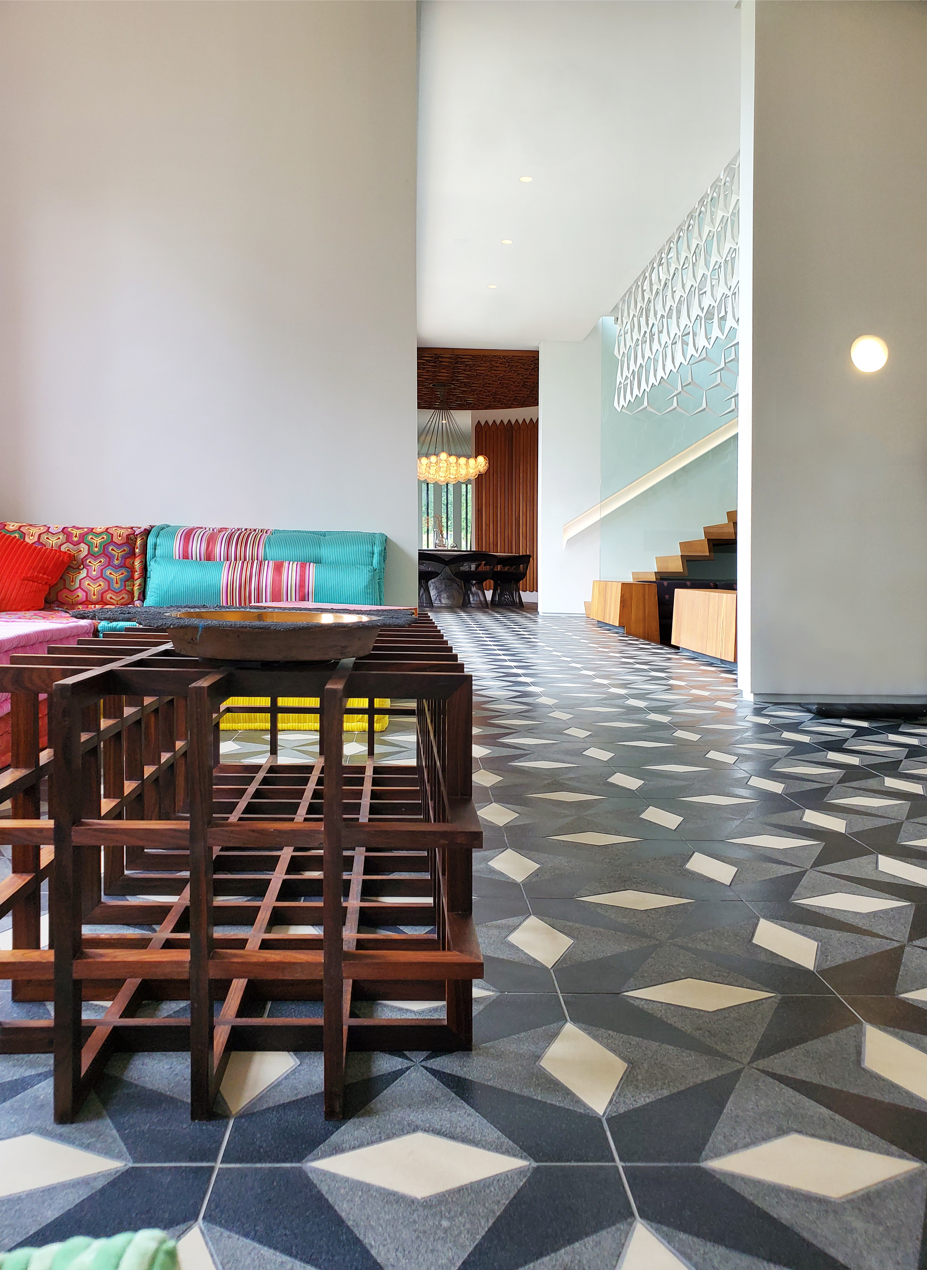 The overall sweep of the interior would remain relatively simple, as a main goal for me was to make this 18K SF building feel humble. Yet, there was occasion for selective details, pulled from the back of our minds as we thought of what we had seen while researching India for the restaurants, years prior. We took the bold decision to cover the main level floor in a star pattern of black granite and white limestone, which would then carry onto certain portions of the exterior of the house. Continuity was another main objective. Doors throughout were made of teak, each designed with a different number of half-sphere inclusions placed vertically in their center. General lighting was also minimal, where the wall sconces were actually inverted into the wall, with no visible source of light, and no protrusion. Ceiling lights were frameless, and continuous whenever possible. Some examples from the house: